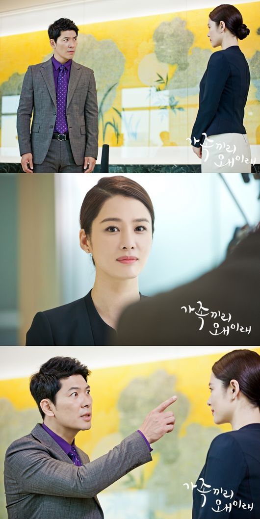 김상경과 김현주는 ‘가족끼리 왜 이래’에서 까칠한 상무 태주와 도도한 여비서 강심 역을 맡아 열연 중이다. 하도 서로를 보고 으르렁 대 ‘으르렁 커플’이라고까지 별명이 붙은 두 사람은 닿을 듯 말듯 오랜 ‘썸’으로 서로의 마음을 확인해가고 있다.