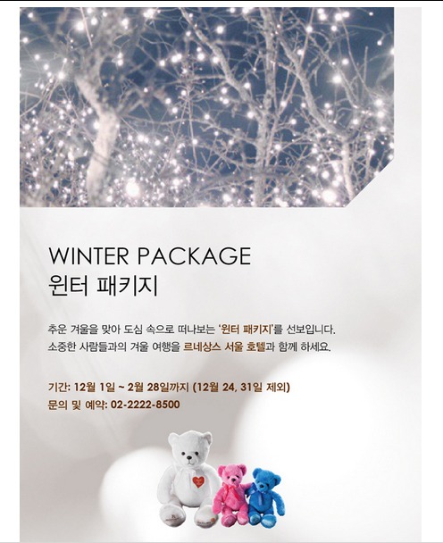 이번에 선보이는 총 3가지의 겨울 패키지는 기본 공통혜택으로 유리돔을 통해 비치는 자연광을 즐길 수 있는 실내 수영장, 르네상스 레크레이션 센터 무료 이용 및 사우나 50%를 포함하여 다양한 고객층을 배려한 풍성한 혜택을 제공한다.