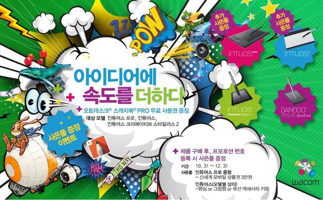 또한, 프로모션 기간 동안 인튜어스 전 모델, 인튜어스 프로 전 모델, 인튜어스 크리에이티브 스타일러스2 제품을 구매한 고객에게는 오토데스크 스케치북 프로 무료 이용권(90일/모바일∙PC호환)이 제공된다. 오토데스크 스케치북 프로는 다양한 툴과 높은 호환성 때문에 크리에이티브 사용자들에게 인기가 높은 애플리케이션으로 사용자들은 이를 활용해 PC 및 모바일 환경에서 자유롭게 스케치 및 드로잉을 할 수 있다.