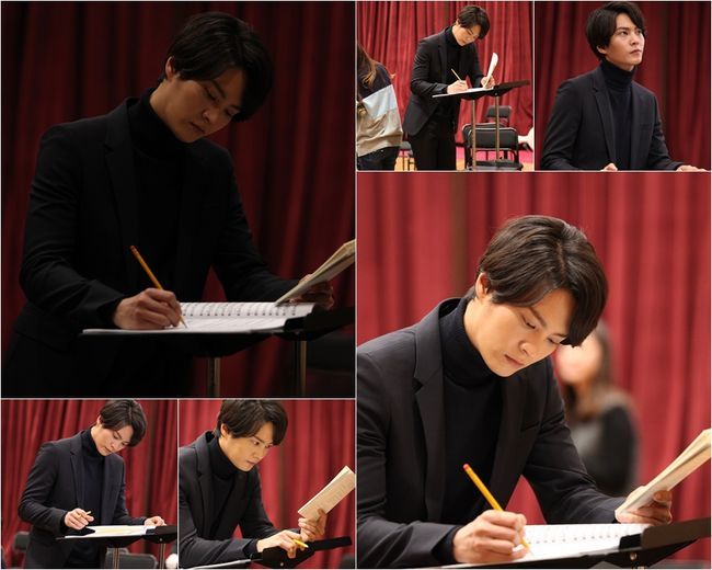 공개된 사진 속에는 지휘자석에 서서 악보와 대본을 뚫어져라 바라보며 진지한 모습으로 연습에 몰두하고 있는 주원의 모습이 담겨있다. 한 손에 들고 있는 연필과 진지한 눈빛이 드라마를 향한 그의 열의를 엿볼 수 있게 한다.
