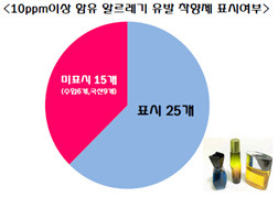 조사대상 40개 중 15개 제품(수입 6개·국산 9개)은 일부 착향제 성분이 10ppm 이상 포함되어 있음에도 제품에 해당 성분을 표시하지 않은 것으로 확인됐다.
