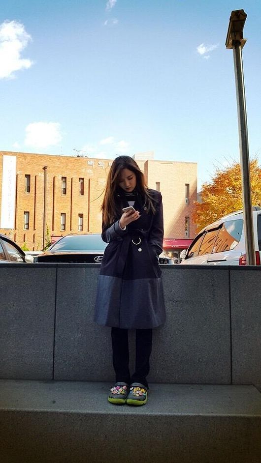 공개된 사진 속 지아는 진지한 표정으로 핸드폰에 집중하고 있는 모습이다. 특히 분위기 있는 차콜색 트렌치코트와 화려한 무늬의 슬리퍼가 대조를 이뤄 눈길을 끌었다.