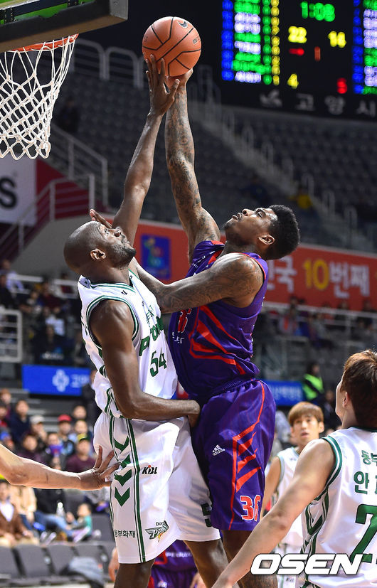 3일 오후 경기 고양시 고양실내체육관서 열린 '2014-2015시즌 KCC 프로농구' 고양 오리온스와 원주 동부의 경기, 1쿼터 동부 리처드슨이 오리온스 가르시아의 슛을 슛블록하고 있다.