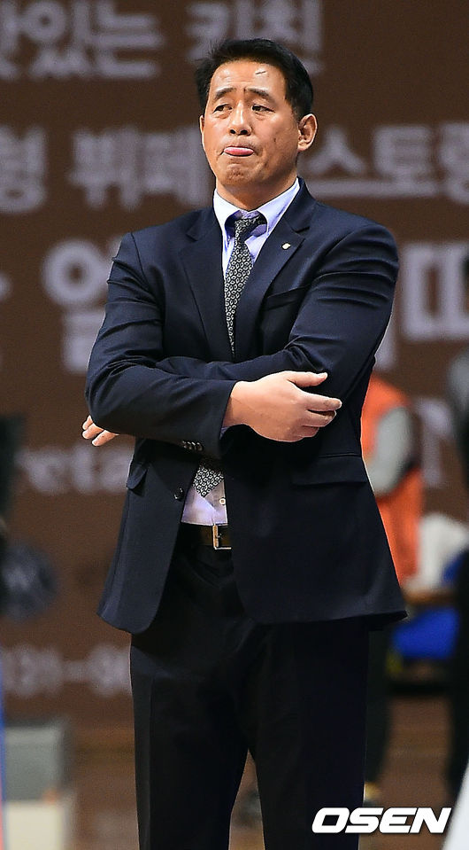 3일 오후 경기 고양시 고양실내체육관서 열린 '2014-2015시즌 KCC 프로농구' 고양 오리온스와 원주 동부의 경기, 2쿼터 오리온스 추일승 감독이 긴장된 표정으로 경기를 지켜보고 있다