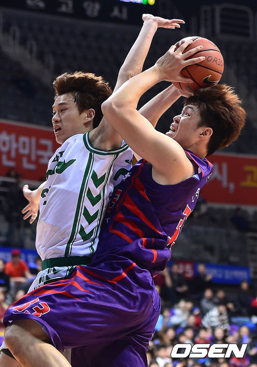 3일 오후 경기 고양시 고양실내체육관서 열린 '2014-2015시즌 KCC 프로농구' 고양 오리온스와 원주 동부의 경기, 2쿼터 오리온스 이승현이 동부 안재욱의 반칙에도 불구 슛을 시도하고 있다