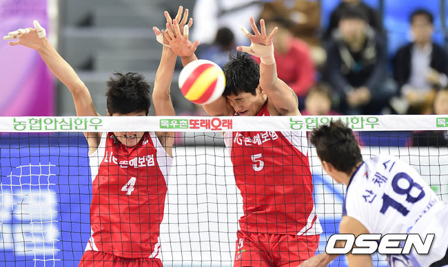 3일 오후 인천 계양체육관에서 열린 '2014~2015 NH 농협 V리그 남자부' 대한항공과 LIG의 경기, 2세트 LIG 정기혁, 김요한이 블로킹을 시도하고 있다.