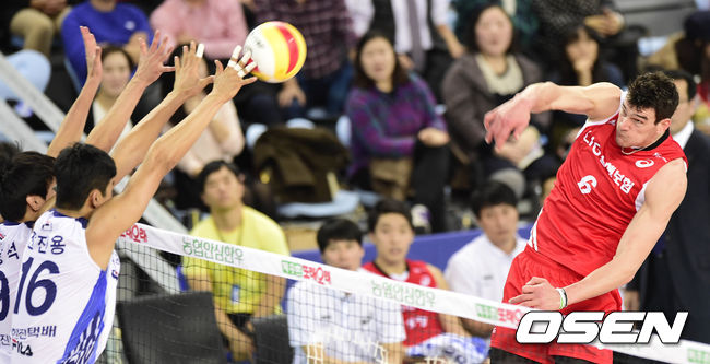 3일 오후 인천 계양체육관에서 열린 '2014~2015 NH 농협 V리그 남자부' 대한항공과 LIG의 경기, 2세트 LIG 에드가가 스파이크를 시도하고 있다.