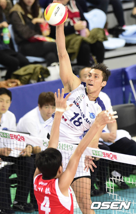3일 오후 인천 계양체육관에서 열린 '2014~2015 NH 농협 V리그 남자부' 대한항공과 LIG의 경기, 1세트 대한항공 산체스가 스파이크를 시도하고 있다.