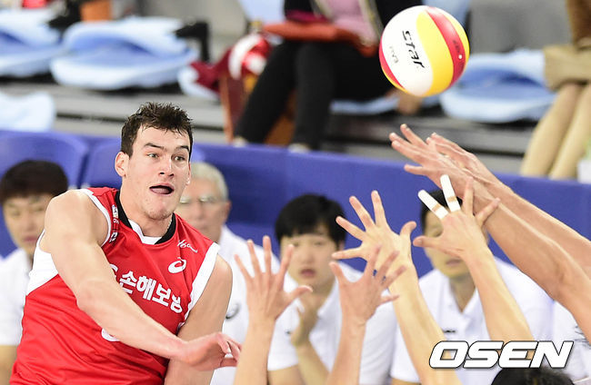 3일 오후 인천 계양체육관에서 열린 '2014~2015 NH 농협 V리그 남자부' 대한항공과 LIG의 경기, 2세트 LIG 에드가가 스파이크를 시도하고 있다.