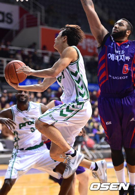 3일 오후 경기 고양시 고양실내체육관서 열린 '2014-2015시즌 KCC 프로농구' 고양 오리온스와 원주 동부의 경기, 4쿼터 동부 허웅이 리버스레이업슛을 시도하고 있다.