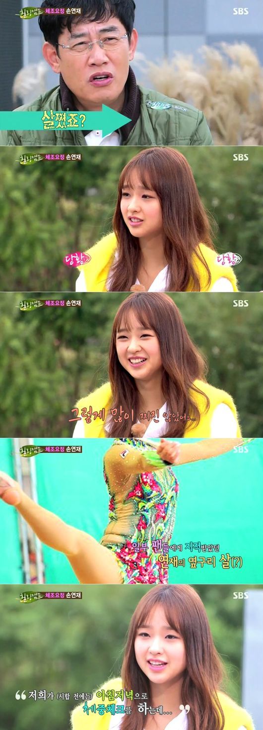 이후 MC들은 손연재의 사진 중 유독 옆구리 살이 부각된 장면들을 공개했는데, 이에 손연재는 “변명을 하자면 허리에 고무줄이 세게 들어가서 그렇다”며 부끄러운 듯 웃음을 지었다.