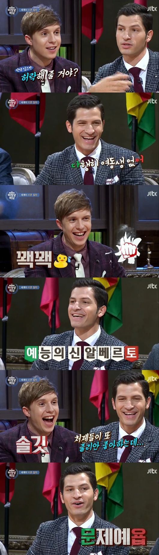 이어 알베르토는 “내가 여동생이 있어서 줄리안과 결혼하면”이라고 상황을 가정했다. 이에 알베르토가 “여동생과 내 결혼 허락해줄거야?”라고 장난스럽게 질문하자, 알베르토는 “다행히 여동생 없어”라고 답해 웃음을 자아냈다.