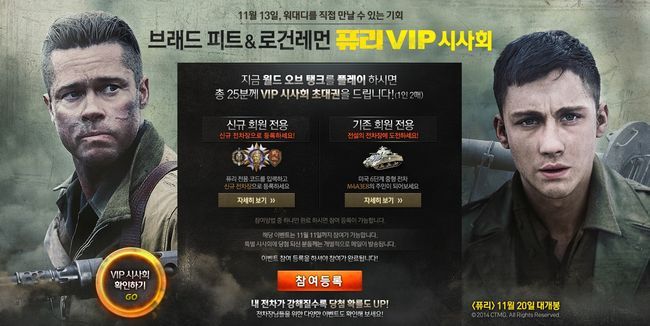 MMO 전략 게임 전문 개발 및 퍼블리셔인 워게이밍(대표 빅터 키슬리, www.wargaming.net)은 브래드 피트가 직접 참석하는 '퓨리' VIP 시사회에 자사의 MMO 액션 게임 '월드 오브 탱크' 회원들을 초청하는 특별 이벤트를 실시한다고 4일 밝혔다.