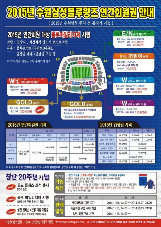 수원의 2015년 연간회원 모집에 대한 보다 세부적인 사항은 구단 홈페이지(www.bluewings.kr)에서 확인이 가능하다.
