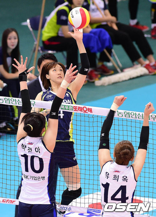 4일 오후 수원시 수원실내체육관에서 열린 '2014-2015 NH농협 V-리그' 현대건설과 IBK기업은행의 경기 1세트 황연주가 공격을 시도하고 있다.