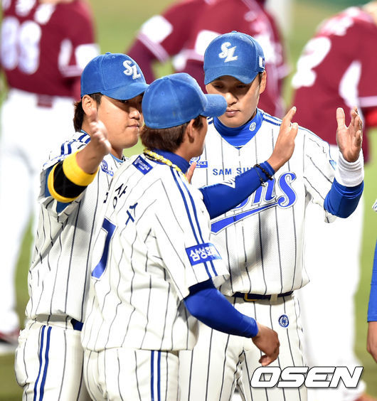 4일 오후 대구야구장에서 열린 2014 한국야쿠르트 세븐 프로야구 포스트시즌 한국시리즈 1차전, 경기, 식전행사 박석민이 입장하는 김상수의 뒤통수를 때리고 있다.