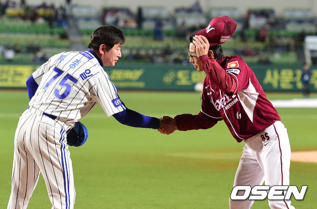 4일 오후 대구야구장에서 열린 2014 한국야쿠르트 세븐 프로야구 포스트시즌 한국시리즈 1차전, 경기에 앞서 삼성 류중일 감독과 넥센 염경엽 감독이 인사를 하고 있다.