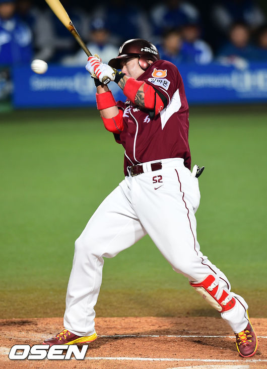 4일 오후 대구구장에서 열린 '2014 한국야쿠르트 세븐 프로야구' 한국시리즈 1차전 삼성 라이온즈와 넥센 히어로즈의 경기, 1회초 2사 1루 넥센 박병호가 삼성 밴덴헐크의 높은 투구를 피하고 있다.