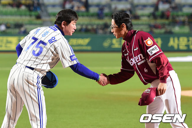4일 오후 대구야구장에서 열린 2014 한국야쿠르트 세븐 프로야구 포스트시즌 한국시리즈 1차전, 경기에 앞서 삼성 류중일 감독과 넥센 염경엽 감독이 인사를 하고 있다.