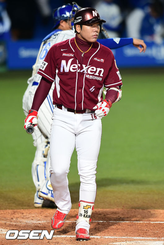 4일 오후 대구구장에서 열린 '2014 한국야쿠르트 세븐 프로야구' 한국시리즈 1차전 삼성 라이온즈와 넥센 히어로즈의 경기, 1회초 2사 1,2루 넥센 강정호가 스탠딩삼진아웃된 뒤 더그아웃으로 들어가고 있다