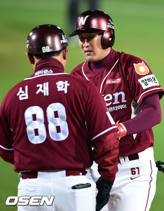 4일 오후 대구구장에서 열린 '2014 한국야쿠르트 세븐 프로야구' 한국시리즈 1차전 삼성 라이온즈와 넥센 히어로즈의 경기, 1회초 2사 넥센 유한준이 안타를 날린후 심재학 코치와 하이파이브를 하고 있다.