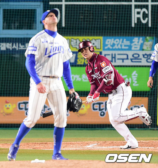 2회초 넥센 공격 선두타자로 나선 김민성이 외야플라이를 날린 뒤 아쉬워하며 1루로 뛰고 있다.