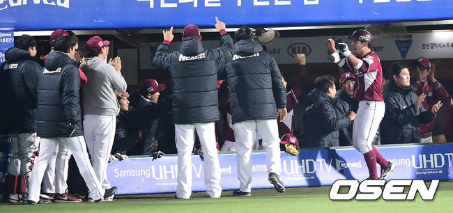 3회초 넥센 공격 무사 3루 상황 로티노의 선제 1타점 우중간 2루타로 홈을 밟은 서건창이 더그아웃 동료들과 인사를 나누고 있다.