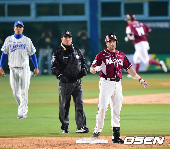 3회초 넥센 공격 무사 3루 상황 로티노가 선제 1타점 우중간 2루타를 날리고 2루에 안착하고 있다.