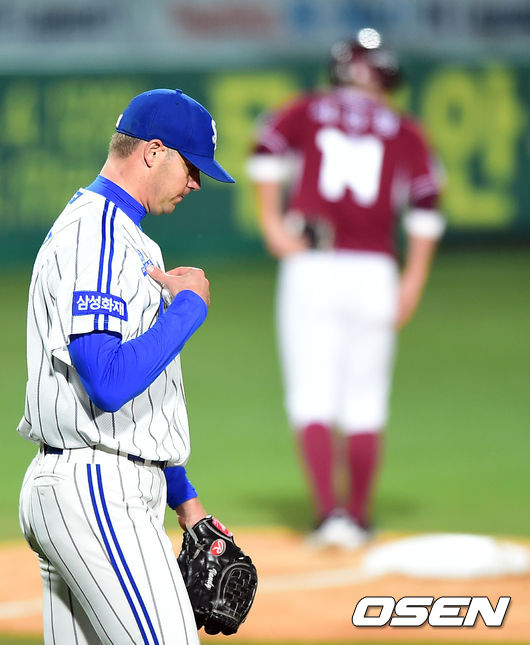 4일 오후 대구구장에서 열린 '2014 한국야쿠르트 세븐 프로야구' 한국시리즈 1차전 삼성 라이온즈와 넥센 히어로즈의 경기, 3회초 넥센 선두타자 서건창에게 3루타를 허용한 삼성 선발투수 밴덴헐크가 아쉬워하고 있다