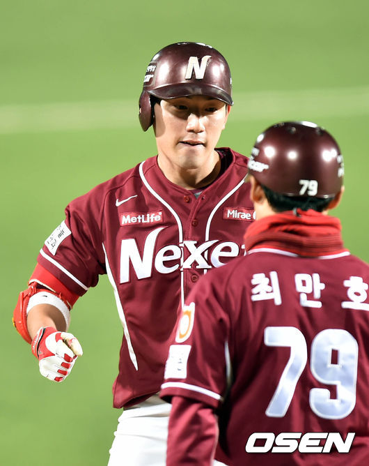 4일 오후 대구야구장에서 열린 2014 한국야쿠르트 세븐 프로야구 포스트시즌 한국시리즈 1차전, 경기, 3회초 무사 서건창이 3루타를 치고 환호하고 있다.