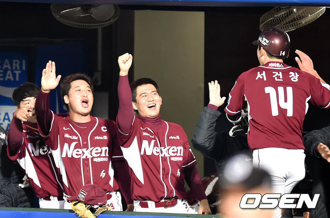 4일 오후 대구야구장에서 열린 2014 한국야쿠르트 세븐 프로야구 포스트시즌 한국시리즈 1차전, 경기, 3회초 무사 서건창이 3루타를 치고 후속타자 로티노의 안타때 홈을 밟아 동료들의 환영을 받고 있다.