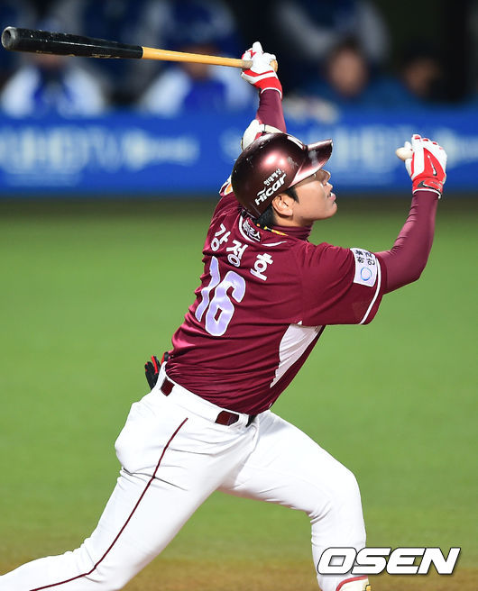 4일 오후 대구구장에서 열린 '2014 한국야쿠르트 세븐 프로야구' 한국시리즈 1차전 삼성 라이온즈와 넥센 히어로즈의 경기, 3회초 1사 3루 넥센 강정호가 희생플라이 타구를 날리고 있다