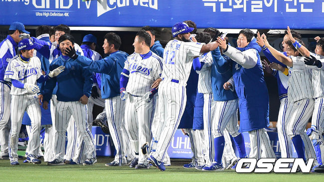 3회말 삼성 공격 무사 1루 상황 나바로가 넥센 선발 밴헤켄을 상대로 동점 투런포를 날리고 더그아웃 동료들과 인사를 나누고 있다.