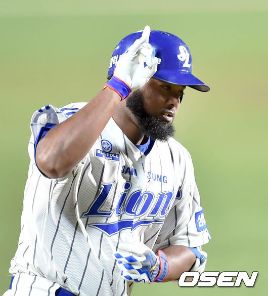 4일 오후 대구야구장에서 열린 2014 한국야쿠르트 세븐 프로야구 포스트시즌 한국시리즈 1차전, 경기, 3회말 나바로가 동점 투런 홈런을 치고 깜직한 세리머니를 하고 있다.
