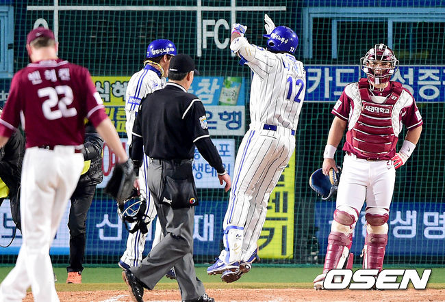 3회말 삼성 공격 무사 1루 상황 나바로가 넥센 선발 밴헤켄을 상대로 동점 투런포를 날리고 홈을 밟으며 기뻐하고 있다.