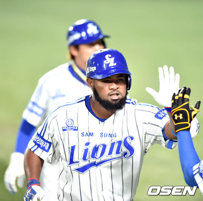 4일 오후 대구야구장에서 열린 2014 한국야쿠르트 세븐 프로야구 포스트시즌 한국시리즈 1차전, 경기, 3회말 나바로가 동점 투런 홈런을 치고 좋아하고 있다.