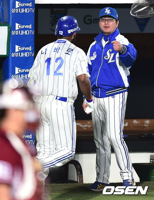 4일 오후 대구구장에서 열린 '2014 한국야쿠르트 세븐 프로야구' 한국시리즈 1차전 삼성 라이온즈와 넥센 히어로즈의 경기, 3회말 무사 1루 삼성 나바로가 동점 2점 홈런을 날리고 류중일 감독과 하이파이브를 하고 있다.