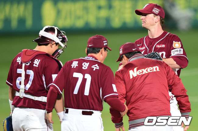 4일 오후 대구구장에서 열린 '2014 한국야쿠르트 세븐 프로야구' 한국시리즈 1차전 삼성 라이온즈와 넥센 히어로즈의 경기, 3회말 넥센 선발투수 밴 헤켄이 류영수 투수코치와 마운드서 이야기를 나누고 있다