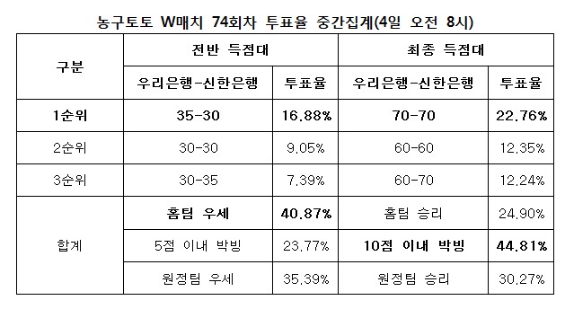 최종 우리은행 70점대-신한은행 70점대 22.76%로 최다 집계…5일 오후 6시 50분 마감