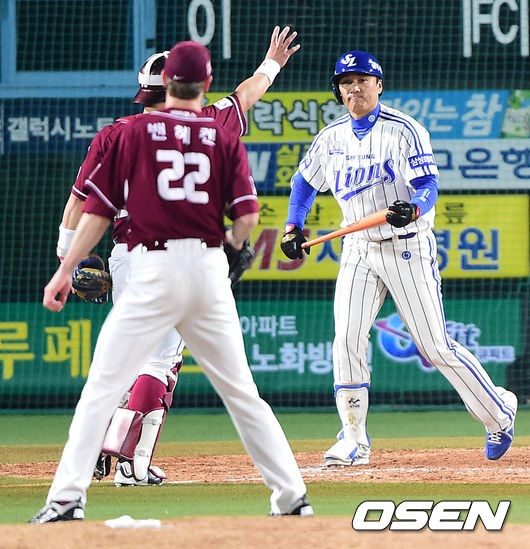 4회말 삼성 공격 1사 주자없는 상황 이승엽이 넥센 선발 밴 헤켄의 공에 삼진을 당한 뒤 아쉬워하며 더그아웃으로 향하고 있다.