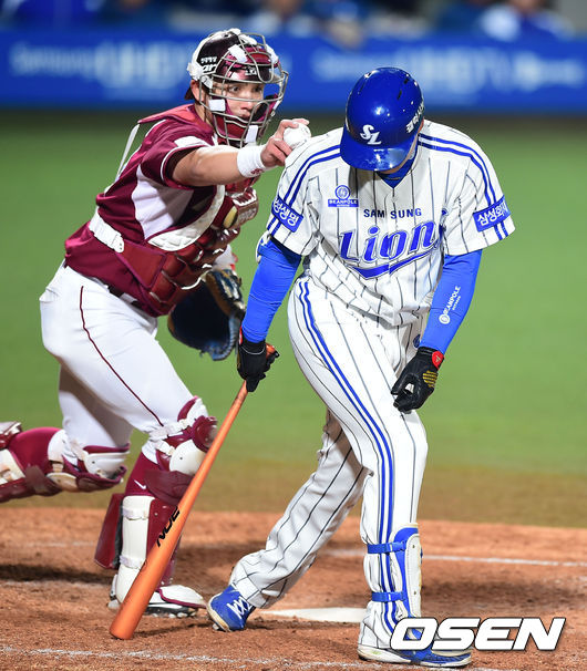 4일 오후 대구구장에서 열린 '2014 한국야쿠르트 세븐 프로야구' 한국시리즈 1차전 삼성 라이온즈와 넥센 히어로즈의 경기, 4회말 삼성 이승엽이 헛스윙 삼진 당하고 있다.