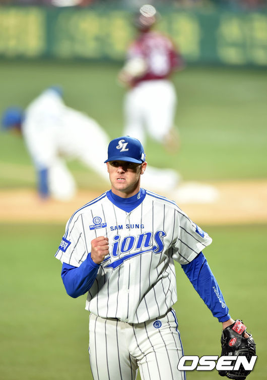 4일 오후 대구야구장에서 열린 2014 한국야쿠르트 세븐 프로야구 포스트시즌 한국시리즈 1차전, 경기, 5회초 1사 1,2루 강정호를 병살로 처리한 밴덴헐크가 주먹을 불끈 쥐고 있다.