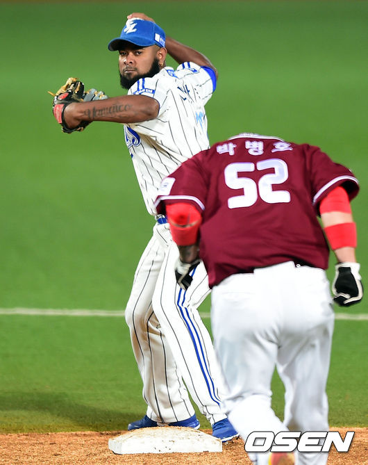 4일 오후 대구구장에서 열린 '2014 한국야쿠르트 세븐 프로야구' 한국시리즈 1차전 삼성 라이온즈와 넥센 히어로즈의 경기, 5회초 1사 1,2루 넥센 강정호의 병살타때 삼성 나바로 2루수가 1루 주자 박병호를 포스아웃 시킨뒤 1루로 송구하고 있다.