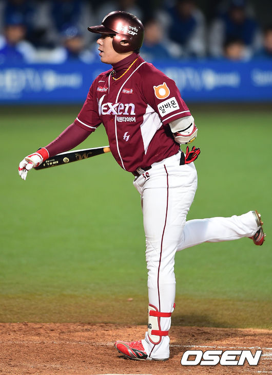 4일 오후 대구구장에서 열린 '2014 한국야쿠르트 세븐 프로야구' 한국시리즈 1차전 삼성 라이온즈와 넥센 히어로즈의 경기, 5회초 1사 1,2루 넥센 강정호가 헛스윙을 하고 있다.