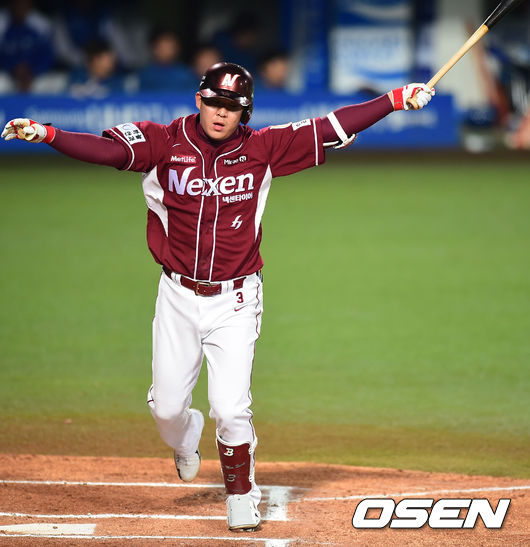 4일 오후 대구구장에서 열린 '2014 한국야쿠르트 세븐 프로야구' 한국시리즈 1차전 삼성 라이온즈와 넥센 히어로즈의 경기,6회초 넥센 선두타자 김민성이 헛스윙 삼진 당하고 있다.