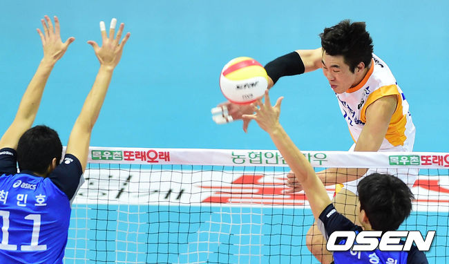 4일 오후 수원시 수원실내체육관에서 열린 '2014-2015 NH농협 V-리그' 한국전력과 현대캐피탈의 경기 1세트 전광인이 공격을 시도하고 있다.