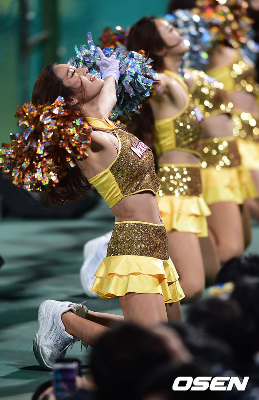 4일 오후 대구구장에서 열린 '2014 한국야쿠르트 세븐 프로야구' 한국시리즈 1차전 삼성 라이온즈와 넥센 히어로즈의 경기, 넥센 치어리더가 멋진 무대를 펼치고 있다.