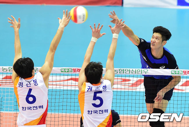 4일 오후 수원시 수원실내체육관에서 열린 '2014-2015 NH농협 V-리그' 한국전력과 현대캐피탈의 경기 2세트 문성민이 공격을 시도하고 있다.