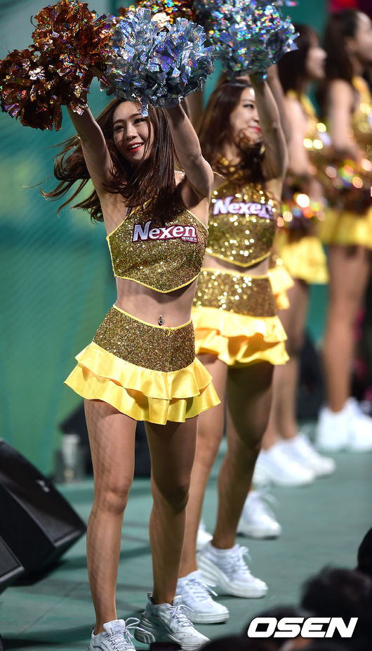 4일 오후 대구구장에서 열린 '2014 한국야쿠르트 세븐 프로야구' 한국시리즈 1차전 삼성 라이온즈와 넥센 히어로즈의 경기, 넥센 치어리더가 멋진 무대를 펼치고 있다.