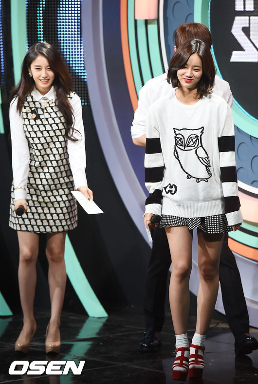 MC 지연이 혜리와 함께 조미에게 애교있는 진행을 한 후 내려오고 있다.